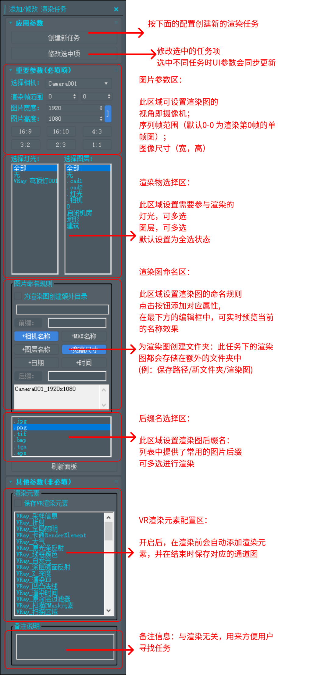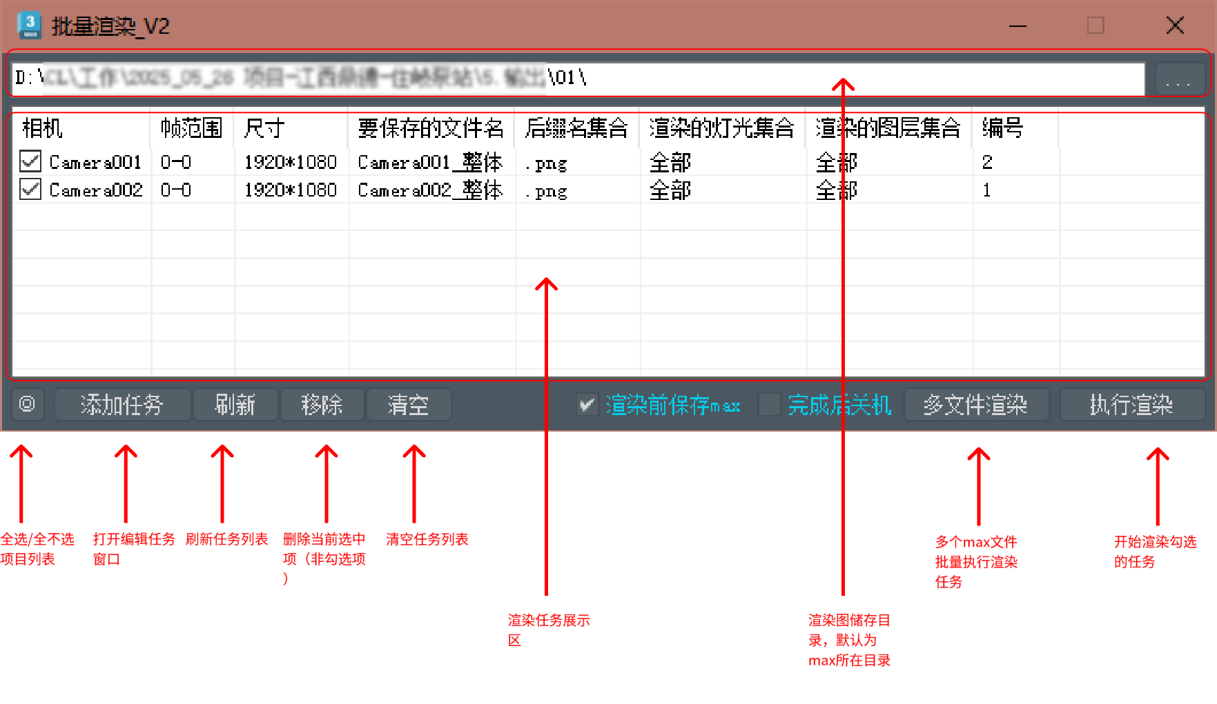 工具提供直观的任务管理界面,允许用户添加、编辑和查看多个渲染任务,支持相机、帧范围和灯光等参数设置。